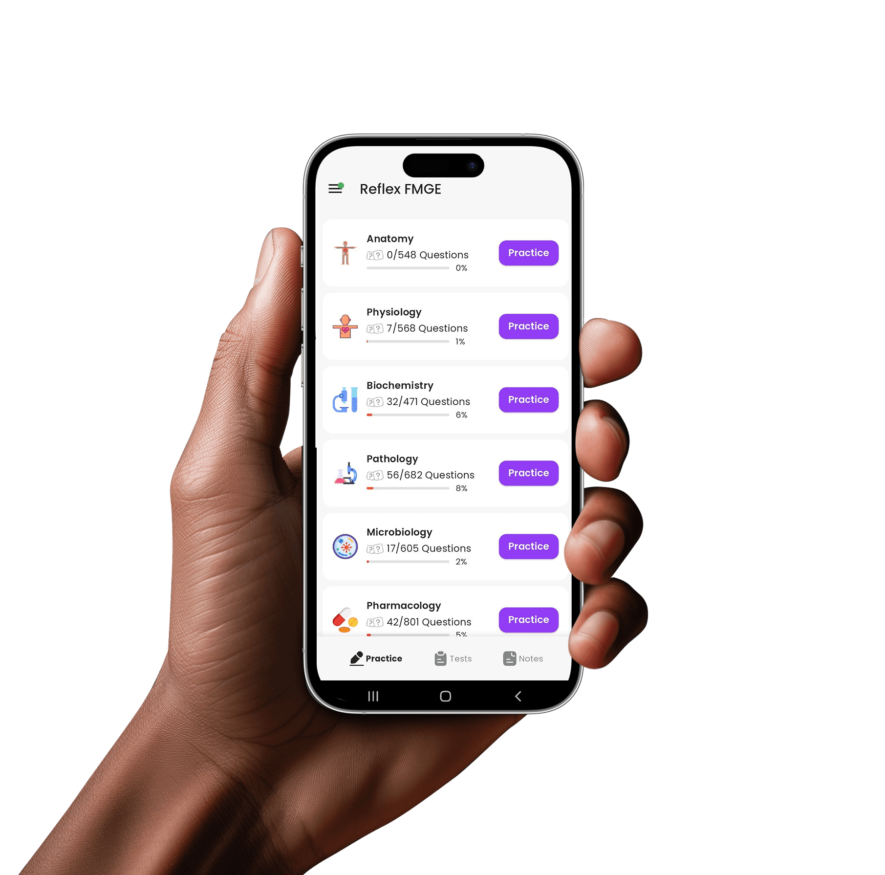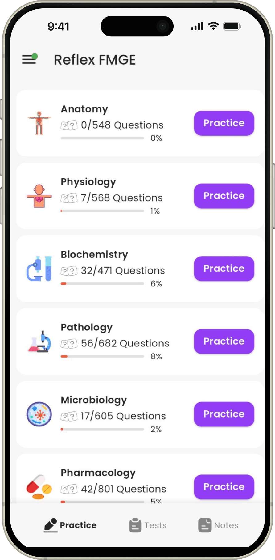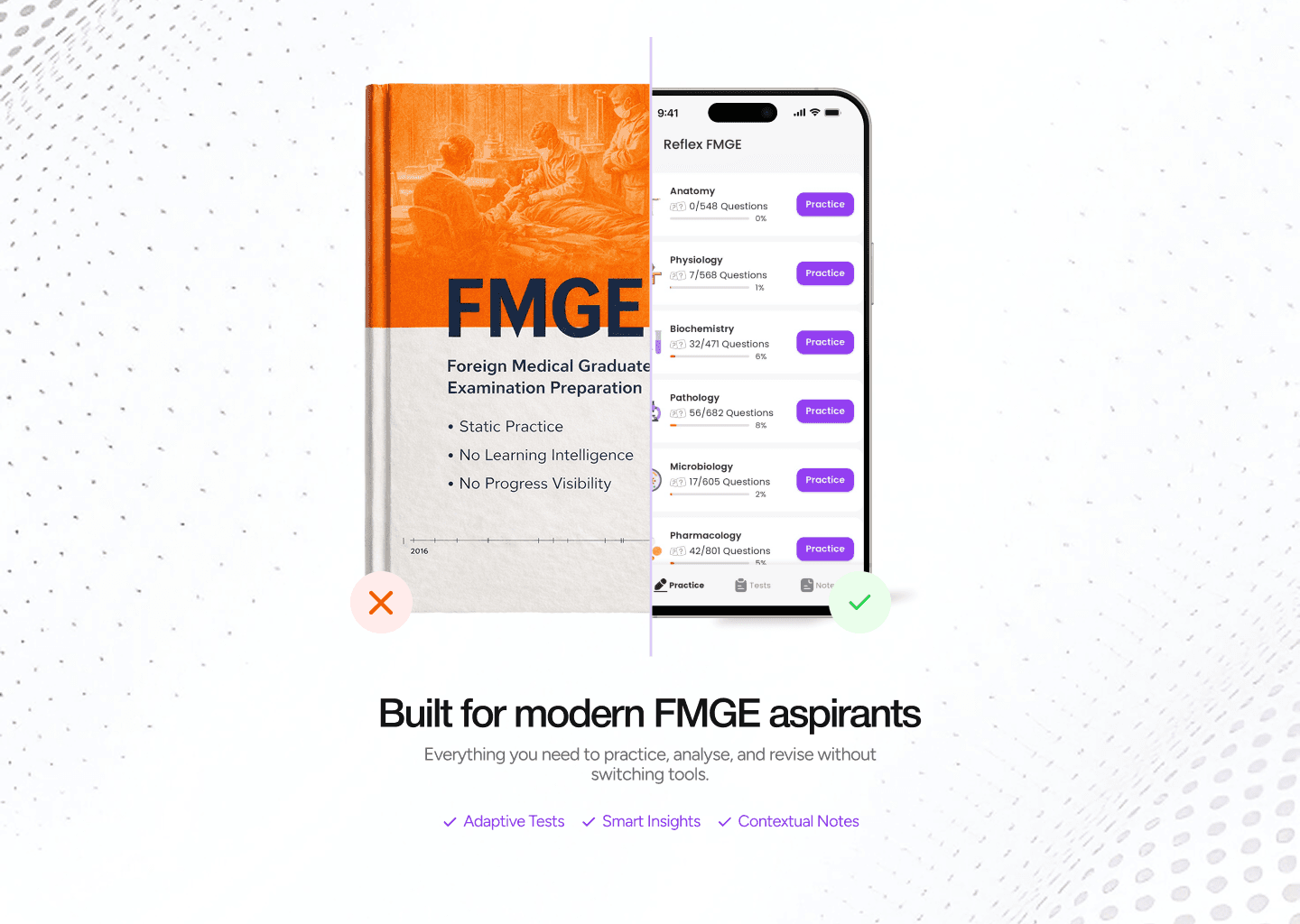 Reflex helps you master FMGE with 4000+ curated PYQs, smart test creation, and detailed insights, built to get you licensed, faster.